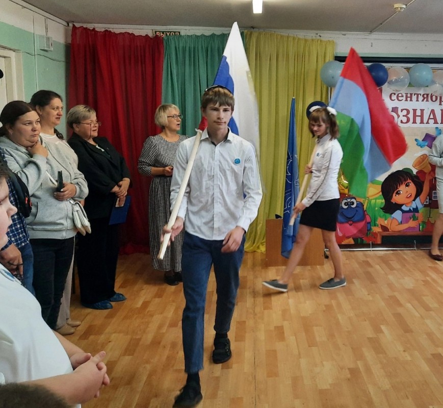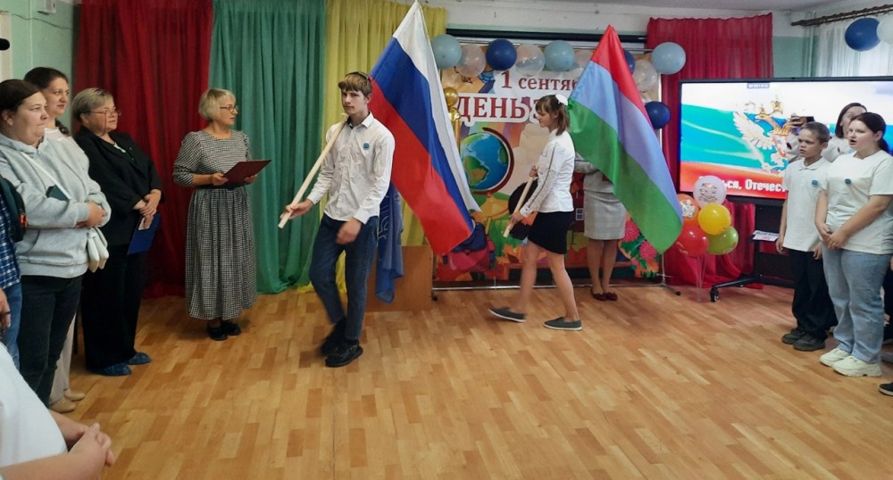 Прозвучал гимн Российской Федерации. Право пронести флаг Российской Федерации было предоставлено ученику 9 класса Шор Ивану, флаг Республики Карелия ученице 9 класса Митюшиной Карине.