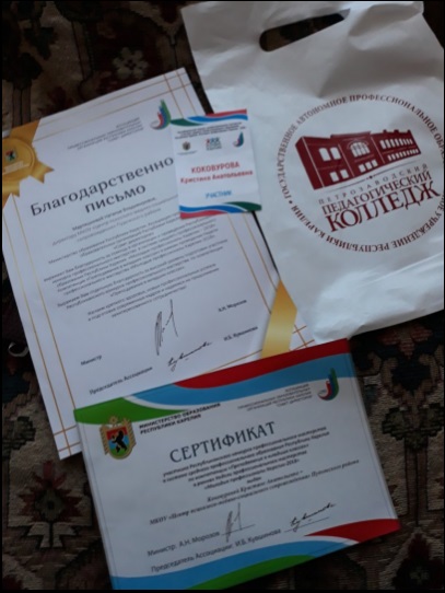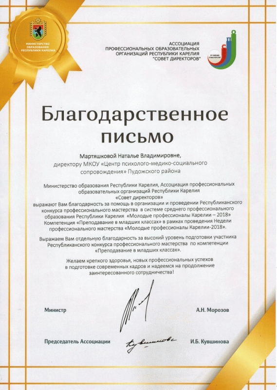 За участие в республиканском конкурсе «Молодые профессионалы Карелии-2018» Коковурова К.А. награждена сертификатом участника, а МКОУ Центр ПМСС благодарственным письмом Министерства образования РК и Ассоциации профессиональных образовательных организаций РК «Совета директоров» за помощь в организации и проведении Республиканского конкурса профессионального мастерства в системе среднего профессионального образования Республики Карелия и высокий уровень подготовки участника республиканского конкурса «Молодые профессионалы Карелии-2018»