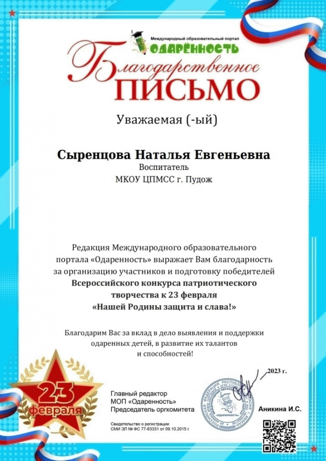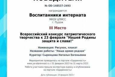 Ребята интерната МКОУ Центра ПМСС под руководством воспитателя Натальи Евгеньевны Сыренцовой приняли участие во Всероссийском конкурсе патриотического творчества к 23 февраля "Нашей Родины защита и слава!" - номинация рисунок "Наша Армия родная!" и заняли победное 3 место!