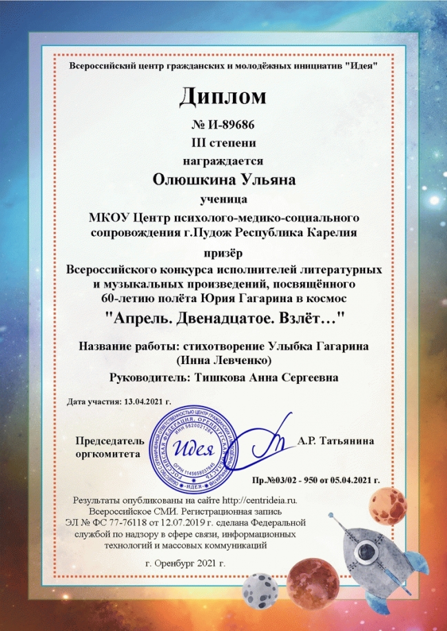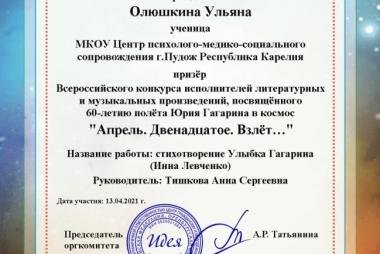 Подведены итоги Всероссийского конкурса исполнителей литературных и музыкальных произведений, посвящённого 60-летию полёта Юрия Гагарина в космос «Апрель. Двенадцатое. Взлёт…», в котором от МКОУ Центра ПМСС приняла участие обучающаяся 7 класса Олюшкина Ульяна. Поздравляем Улю с победой!!!
