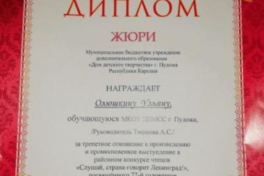 За трепетное отношение к произведению и проникновенное выступление в районном конкурсе чтецов Ульяна награждена Дипломом.