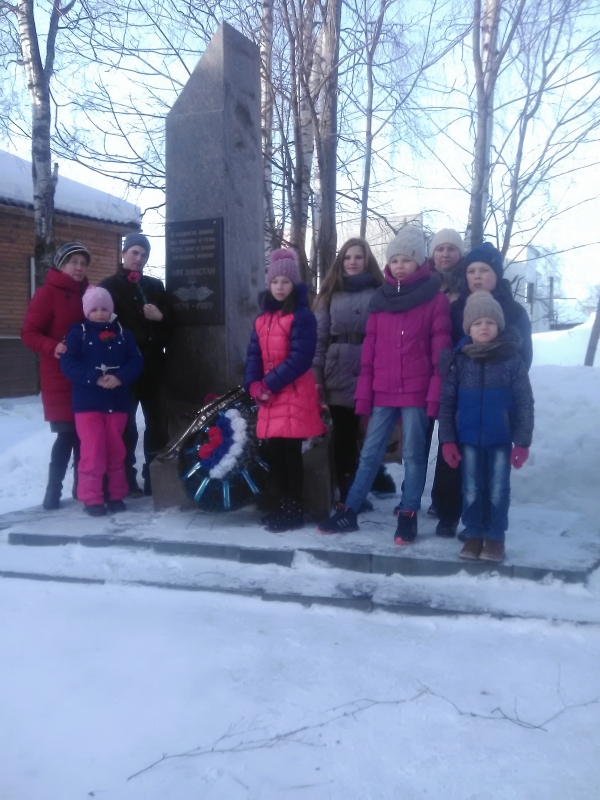 18 февраля учащиеся и воспитанники интерната МКОУ Центра ПМСС вместе с воспитателями Ремезовой Юлией Николаевной и Ефимовой Татьяной Викторовной возложили цветы к стеле погибших воинов Пудожского района во время выполнения интернационального долга в демократической республике Афганистан. День вывода войск из Афганистана не только повод отдать дань памяти тем, кто погиб в той страшной войне, это еще и знак того, что необходимо заботится о тех, кто прошел эту войну.