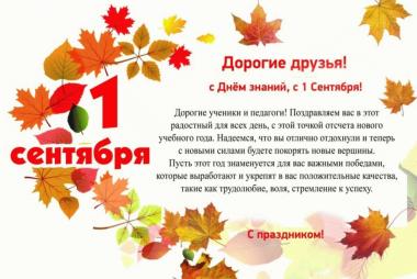 Дорогие ребята и родители! Поздравляем всех вас с Днем знаний! Пусть впереди ждет много интересного, каждый урок дарит открытия, а учебный год будет успешным. Желаем, чтобы один из самых главных дней в сентябре запомнился веселым волнением, улыбками, радостью предвкушения новизны. Старания, усердия, терпения, удачи!