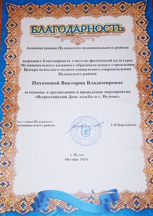 «Территория спорта. День ходьбы-2025»️Командой Центра ПМСС Пудожского района директор, педагоги и обучающийся 9 класса Евгений Ч. приняли активное участие в спортивном событии страны - Всероссийском "Дне ходьбы - 2025"!Вместе дружно и легко преодолели спортивные дистанции.Прекрасный результат показал в своей возрастной категории Евгений Ч, обучающийся 9 класса, занявший 1 место.Учитель Ирина Михайловна Рудная, Воспитатель Наталья Евгеньевна Сыренцова и директор Наталья Владимировна Мартяшкова заняли 3 место в своих возрастных категориях! Поздравляем!Пусть здоровье, оптимизм, активность, удача и боевой дух будут вашими спутниками во всех добрых делах!Одним из организаторов мероприятия стала учитель физической культуры Виктория Пахомова.