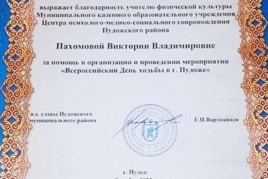 Учителю физической культуры Виктории Владимировне Пахомовой вручено Благодарственное письмо Администрации Пудожского муниципального района за помощь в организации и проведении мероприятия.